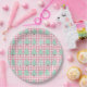 This adorable Christmas paper plate features an assortment of whimsical, pastel Christmas trees on pink plaid background.