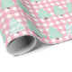 This adorable Christmas wrapping paper features an assortment of whimsical, pastel Christmas trees on pink plaid background.