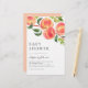 Invite guests to your event with this customisable baby shower invitation. It features watercolor peaches. Personalise by adding your details. This peach baby shower invitation is perfect for spring and summer baby showers. The texts are fully editable for any event.