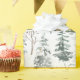 This holiday wrapping paper features a watercolor winter pattern of snowy pine trees and bare tree branches sprinkled with gold stars for a festive look.