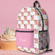 A delightful personalised backpack design featuring pink vanilla cupcakes topped with chocolate chip cookies, surrounded by chocolate candies and colourful accents.