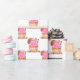 A whimsical wrapping paper design featuring a repeating pattern of pink vanilla cupcakes topped with chocolate chip cookies, surrounded by chocolate candies and colourful accents.