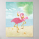 Charming flamingos on the beach, featuring pink patterns, starfish, ocean and palm tree backdrop in a watercolor style.