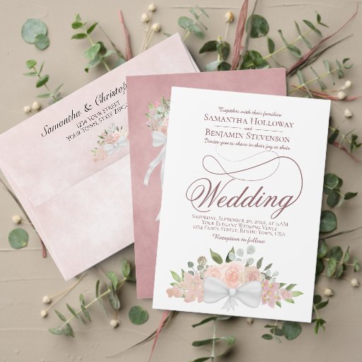 These beautiful wedding invitations feature a rustic yet beautiful hand painted watercolor wreath of blush pink roses, flowers, foliage and sprigs of garden greenery with a white satin bow at the bottom. The design is simple yet elegant with fancy script lettering on a white background. The back features an elegant floral bouquet tied with a white ribbon on a marbled mauve pink background. Beautiful way to invite your friends and family to share in your special day.