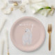 A modern elegant set of dusty pink Christmas paper plates designed with a hand-painted watercolor polar bear and stylish typography in white and gold
