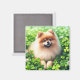 Fridge magnet featuring an adorable orange Pomeranian dog laying a field of clover with a few shamrocks. A cute St. Patrick's Day gift for Pomeranian owners and pom lovers.