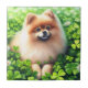 Ceramic tile featuring an adorable orange Pomeranian dog laying a field of clover with a few shamrocks. A cute St. Patrick's Day gift for Pomeranian owners and pom lovers.
