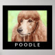 Dog posters with a watercolor apricot poodle print. Black background border and breed name printed on bottom in white text.