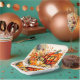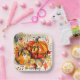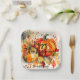 This customisable Thanksgiving paper plate features a vibrant and warm autumnal design, perfect for celebrating the season. At the centre of the plate are beautifully illustrated orange pumpkins, surrounded by a variety of richly coloured fall leaves in shades of yellow, orange, red, and hints of green. The leaves have detailed veining and shading that give them a lifelike appearance. Above the pumpkins, in an elegant cursive font, reads “Happy Thanksgiving!” which adds to the festive spirit of the design. Below the pumpkin is space for personalisation. This feature makes it an ideal choice for those looking to add a personal touch to their holiday gatherings. The square shape of the plate adds a modern twist to traditional round plates and its soft edges give it an inviting feel. This paper plate combines functionality with aesthetic appeal, making it not only a practical item for serving Thanksgiving meals but also an attractive addition to any holiday table setting.