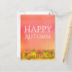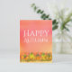 A pretty postcard for autumn featuring a row of bright orange pumpkins and watercolor flowers with a red, orange and yellow watercolor wash background.