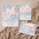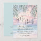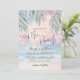 Simple Seaside Watercolor Summer On The Beach Wedding Invitation. The background blends a soft pink, purple, blue, and tan sunset sky that gently transitions into the ocean and sandy shoreline, with the beach set at a slight angle for a modern coastal feel. The artwork stays calm and slightly abstract as waves meet the sand, while palm leaves rest at the top above the horizon for a subtle tropical touch.