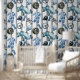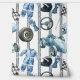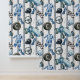Fun watercolor racing pattern with vintage blue cars, helmets, gloves, wheels, and checkered flags with tire-track stripes background, perfect for nursery decor and little car lovers