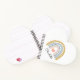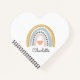 A cute personalised kid's watercolor boho rainbow heart shaped notebook featuring a pink mustard and blue rainbow with pink heart in the middle and name.