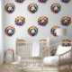 Cheerful watercolor flowers and rainbows stick n peel wallpaper. Red, purple, yellow, green, orange and blue colourful pattern.