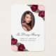 Elegant watercolor red and pink floral memory card/funeral prayer card featuring a photo adorned with blush pink and burgundy red roses and baby's breath flowers on a plain white background.