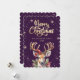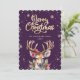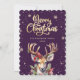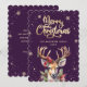 Purple and gold calligraphy Christmas card featuring a watercolor painting of a reindeer, holly, red berries and other winter botanicals on a dark purple background adorned by snowflakes.
