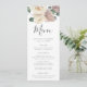 Elegant floral wedding menu card featuring a top border of painted cream white roses, blush and mauve pink orchids, and green leaves and foliage. Personalise the floral wedding menus by adding your names, wedding date, and wedding menu details. Designed to coordinate with our Watercolor Roses and Orchids wedding collection.