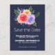 Save the date postcard for a mother's day brunch or other event. Designed with a nice bouquet of watercolor roses with sprigs, leaves and branches all together in a colourful floral arrangement. Navy blue background.
