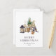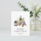 This cosy, rustic holiday postcard features a watercolor illustration of a cute female gnome seated next to a miniature Christmas tree, a basket of birch logs, and some candles. The words "MERRY CHRISTMAS" appear in grey serif letters that coordinate with the art. Add your family's name and the year in charcoal grey italics, and your return address on the reverse.