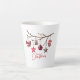 Holiday latte mug featuring a watercolor illustration of ornaments of mittens, pinecones, bows and stars hanging on a branch with the greeting Merry Christmas below in a colour to match illustrations. Additional sizes available.