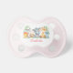 Watercolor Safari Baby Animals Pink Baby Pacifier. Baby Animals include Elephant, Monkey, Giraffe, Rhino, Zebra and Lion on fern leaves. Watercolor Botanical Greenery. Add Name.