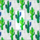 A bright fun fabric decorated with saguaro cactus illustrated with watercolor in shades of green and blue with a spatter background. Colourful for home decor and crafts. Great for those who live in the desert!