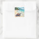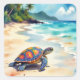 A vibrant sea turtle in watercolor art with a colourful shell is seen on a sandy beach, walking towards the turquoise waters of the ocean