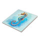Ceramic tile in a watercolor design of a quirky, colourful seahorse with tan, turquoise, and aqua hues. The coiled tail and bumpy texture give it personality, and the soft turquoise background adds a dreamy underwater feel.