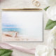 "Seas the Day" quote in beach sand. Captivating watercolor of beached fishing boat on beach with tropical aqua blue ocean, and sunny sky above. Template on back flap for return address.