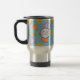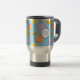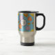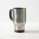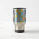 Stay hydrated during your trip with this travel/commuter mug decorated with a colourful pattern of red,yellow, and violet seashells in watercolor, on a light blue background. Available in silver stainless steel or white, as well as in different mug styles and sizes.
