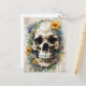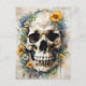 This unique watercolor painting features a skull adorned with delicate yellow and white wildflowers, with expressive paint drips adding a touch of abstract artistry. The combination of soft florals and edgy elements creates a striking balance between beauty and decay, perfect for gothic and nature-inspired decor.