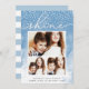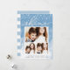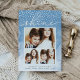 Share holiday greetings with these chic Hanukkah photo cards featuring three of your favourite photos (1 landscape, 2 square) arranged in a rectangular collage layout on a pale blue watercolor wash background accented with falling snow. "Shine" appears at the top in elegant hand lettered script typography. Personalise with your custom Hanukkah greeting, name(s) and the year along the bottom. Cards reverse to a stripe pattern in matching pastel blue and white.