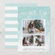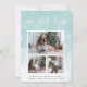 Share holiday greetings with these chic Christmas photo cards featuring three of your favourite photos (1 landscape, 2 square) arranged in a rectangular collage layout on a pale aqua watercolor wash background accented with falling snow. "Merry" appears at the top in elegant hand lettered script typography. Personalise with your custom holiday greeting, name(s) and the year along the bottom. Cards reverse to a stripe pattern in matching pastel turquoise and white.