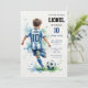 Kick off the celebration for your little soccer star! This personalized birthday party invitation features a beautiful watercolor illustration of a young player, perfect for an action-packed party. The artistic and modern design, with its cool blue and green splashes of color, will get everyone excited for game day. Easily customize all the details to invite friends and family to your son's big match. It's the perfect way to set the theme for a fun and memorable birthday!