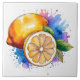 Whole and half lemon accented with a blue and purple watercolor splash. Bring some citrus festivity to your kitchen.