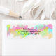 A set of address labels with a cheerful unique looking abstract design created with watercolors. A rainbow of colours splash across the canvas in summery colours like yellow, green, turquoise, pink and more. Circles and splatters dance across the page in a horizontal line on a cream coloured background.