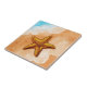 Ceramic tile in a watercolor illustration of a starfish with textured details, resting on a sandy beach with soft waves and a splash of ocean blue. The mix of warm tones and cool water gives it a laid-back, beachy feel.