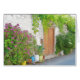 Watercolor street view with colourful flowers, door and stone wall in Cyprus