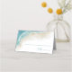 This elegant summer coastal destination wedding reception place card features a hand painted watercolor beach scene in the corner with ocean waves lapping on the sea shore.