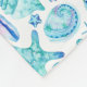 A hand painted summer coastal design of watercolor seashells and starfishes in blue and green hues arranged into a pattern.