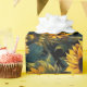 An artistic rendering of cheerful sunflowers in watercolors. Bright yellow flowers with dark green leaves and a dark background fill this design with joy.