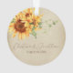 This romantic wedding keepsake ornament features a vintage floral design. The background is a rustic looking, faded parchment paper design, accented with golden watercolor sunflowers. A delicate wild bouquet is pictured at the top, with the names of the couple printed below.