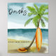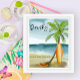 Baby on Board! Baby shower invitation - perfect for a summer baby shower. Beach theme. Watercolor design has a ocean and beach scene with surfboard, palm tree and summer hat.