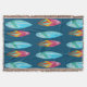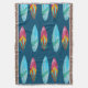 Two different surfboard designs in watercolor illustration make up this "beach life" themed pattern highlighted on a dark teal background