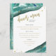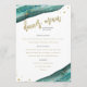 This elegant, modern wedding menu features watercolor teal geode stones, with faux gold typography and splashes.