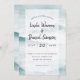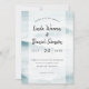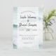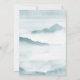 Modern wedding invitation, featuring a landscape of teal blue watercolor misty mountains