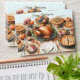 Watercolor illustration of a beautifully arranged Thanksgiving feast on a wooden dining table. The centerpiece is a roasted turkey surrounded by an array of colourful dishes. Small decorative pumpkins accent the table, and there are candles providing a warm glow. The table setting includes plates, silverware, and glasses, creating a cosy, festive atmosphere. Designed by artist Danguole Serstinskaja