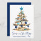 Modern Minimalist Elegance Calligraphy Ink Pen Handwritten Script Seas & Greetings Coastal Holiday Card includes a Watercolor Christmas Tree make of beach ocean driftwood, seashells, sand dollars, nautical anchor ornament and topped with a starfish. Navy Blue Back.