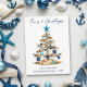 Modern Minimalist Elegance Calligraphy Ink Pen Handwritten Script Seas & Greetings Coastal Holiday Postcard includes a Watercolor Christmas Tree make of beach ocean driftwood, seashells, sand dollars, nautical anchor ornament and topped with a starfish. Navy Blue Text.