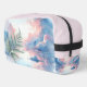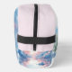 A modern accessory pouch is adorned with a nature-inspired tropical theme, featuring a watercolor background of blue, pink and white fluffy clouds. It's accented with a flowing green fern frond on both the front and back. Add your initials or name as desired.
